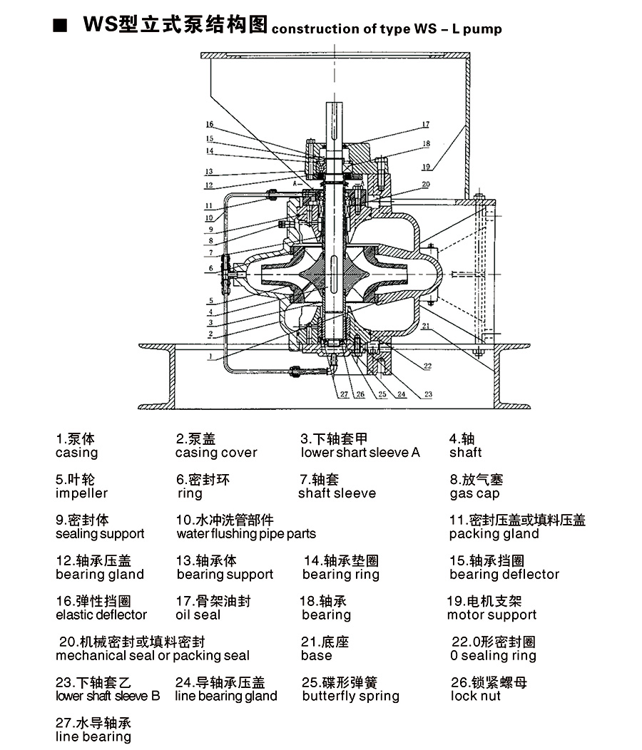 5、WS型泵铸件可根据不同工况采用立式或卧式安装,采用机械密封或填料密封。